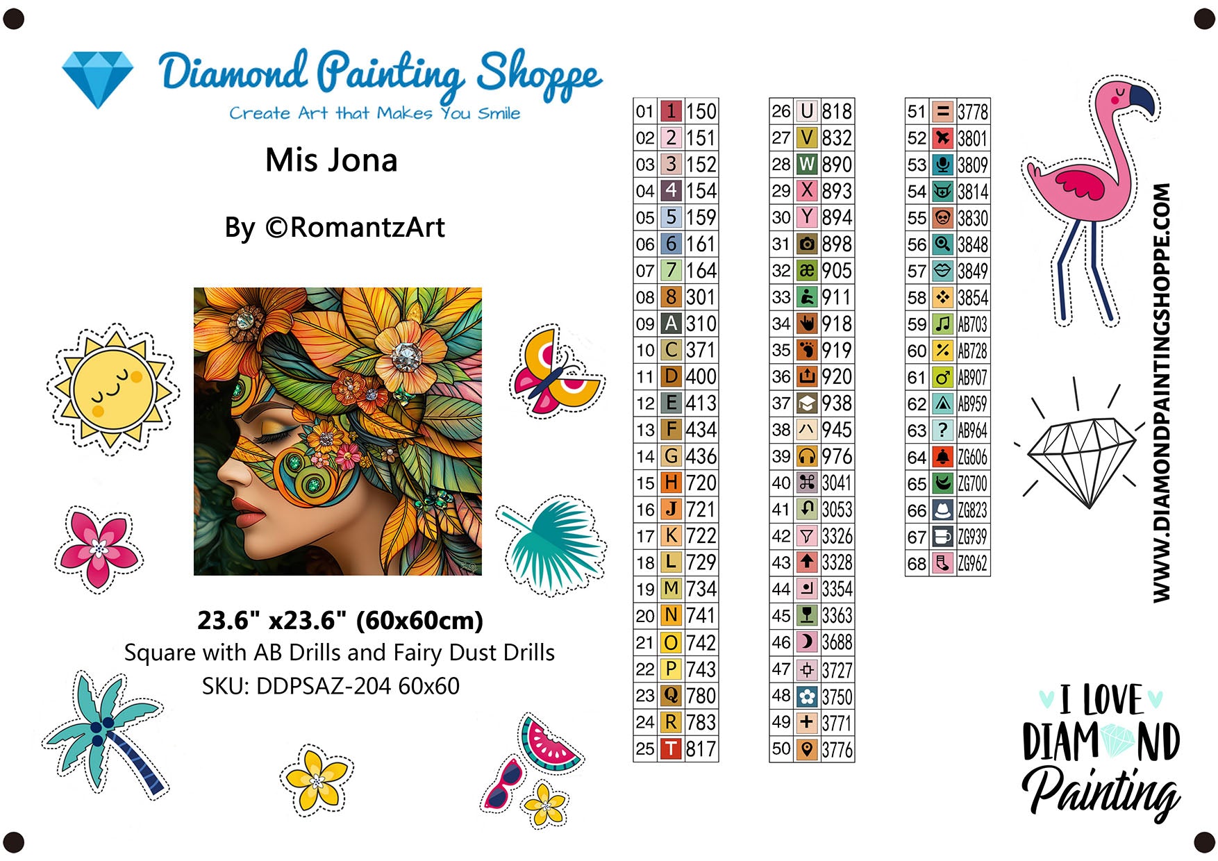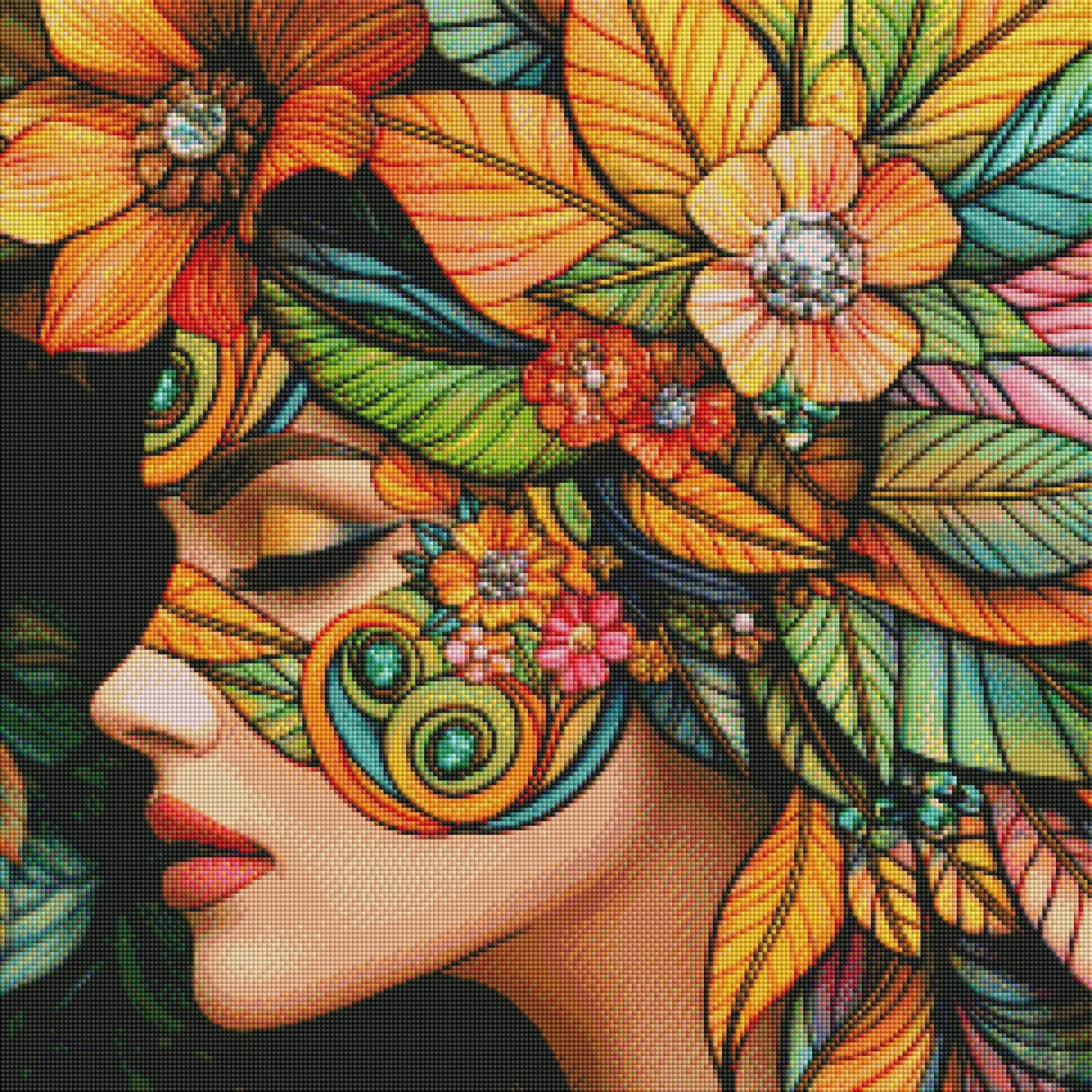 Unleash your inner artist with the "Mis Jona" Diamond Painting Kit—a mesmerizing blend of color, elegance, and intricate detail. This vibrant composition features a serene female profile adorned with radiant blossoms, jeweled accents, and flowing leaves in a dazzling palette of amber, emerald, sunrise orange, and sapphire blue. Each facet sparkles like a gemstone, inviting you into a world of imagination and peace.