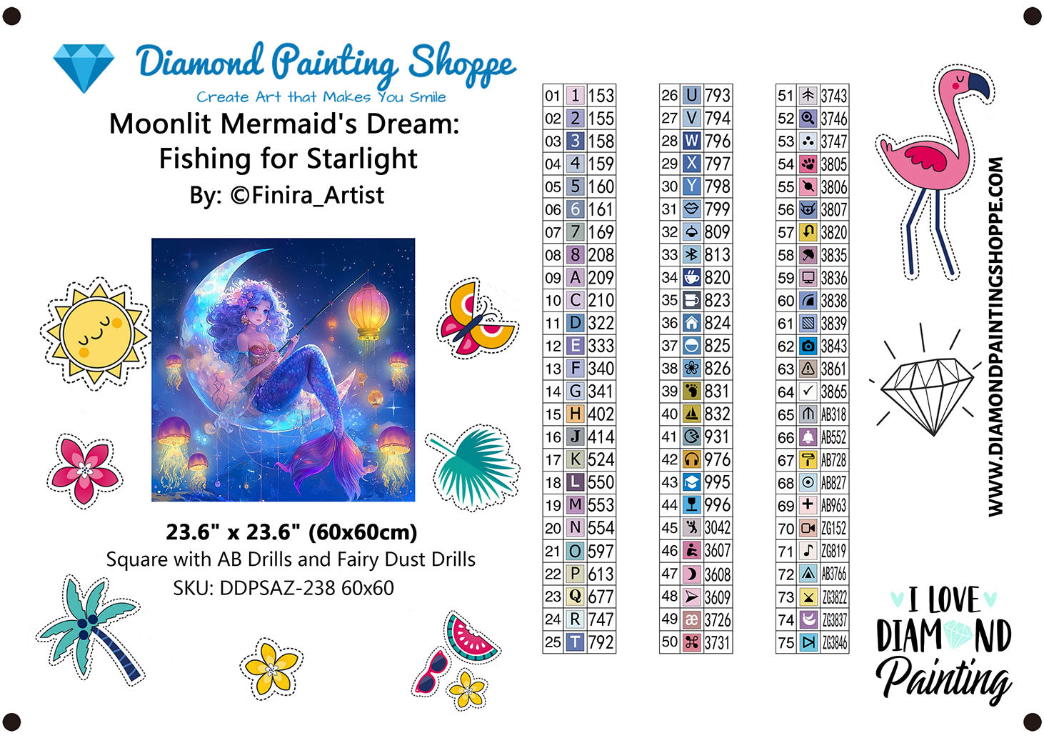 Drift away into a reverie of imagination with the "Moonlit Mermaid's Dream: Fishing for Starlight" diamond painting kit. This enchanting design features a radiant mermaid perched on a glowing crescent moon, fishing amidst a sea of twinkling stars, lanterns, and luminous jellyfish. Her shimmering scales and cascading floral hair are bathed in magical moonlight, inviting you to capture the beauty of night and the wonder of dreams—one sparkling gem at a time. Bring this celestial fantasy to life and fill your world with starlit enchantment!