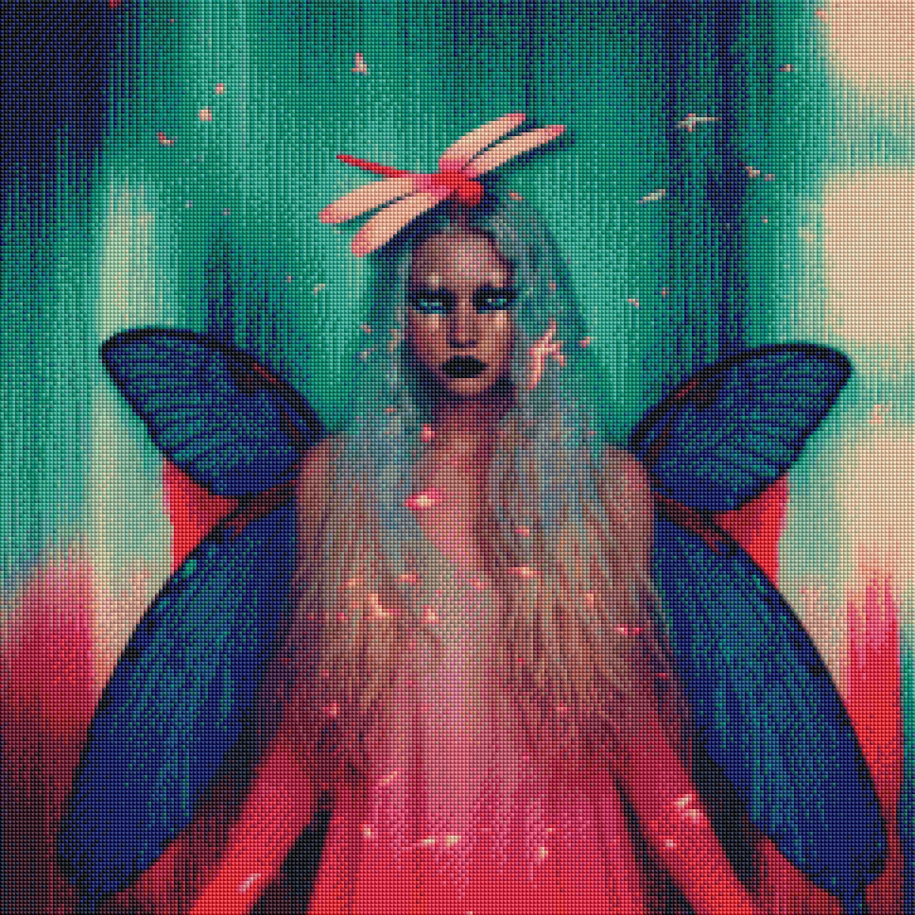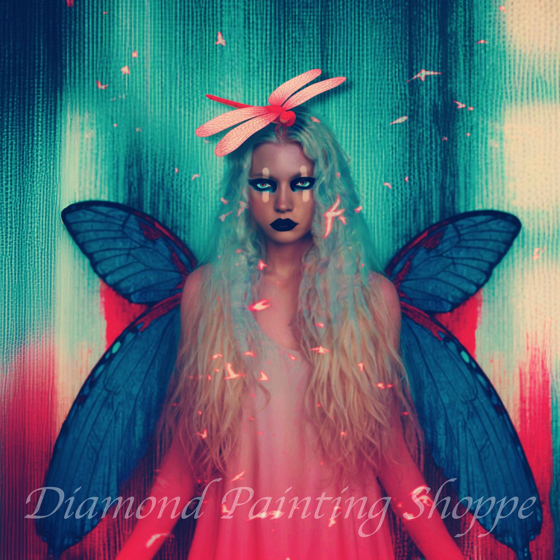 Diamond painting image of a surreal fairy with long platinum hair, dramatic blue wings, glowing eyes, and a dragonfly crown, framed by a dreamlike teal and pink background.