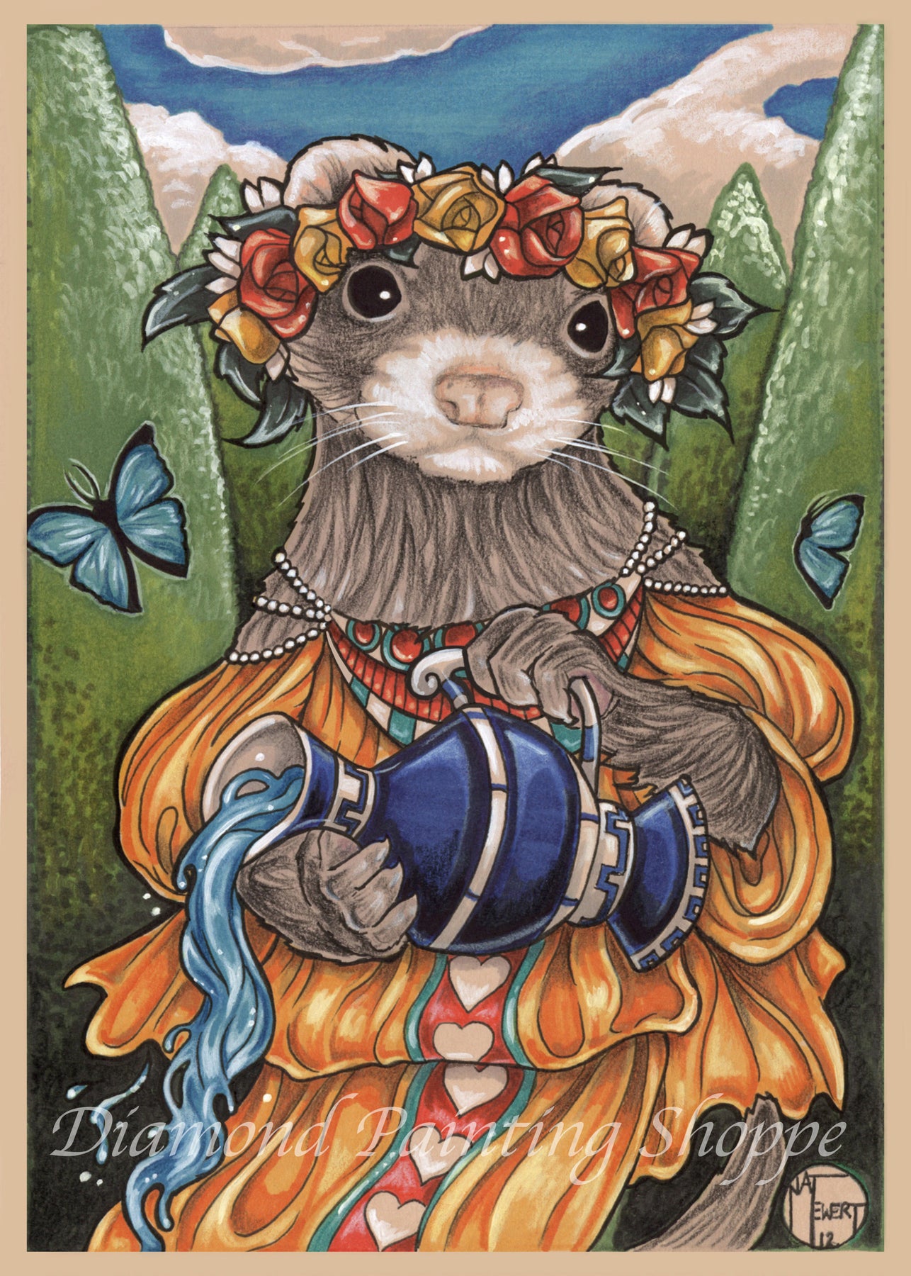 Whimsical diamond painting artwork of a ferret dressed in Grecian robes, wearing a floral crown and pouring water from a blue vessel, set against a classical landscape.