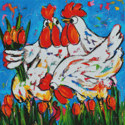 Capture the charming beauty of nature with this stunning diamond painting by Vrolijk Schitderj. Three playful chickens frolic amongst the vibrant tulips in a picturesque garden setting, their cheerful expressions bringing a sense of joy and wonder to any room. With intricate details and eye-catching colors, this diamond painting is sure to spark feelings of adventure and curiosity in all who behold it. Add a touch of whimsy to your home decor with this delightful artwork that celebrates the simple pleasures of life in the countryside.