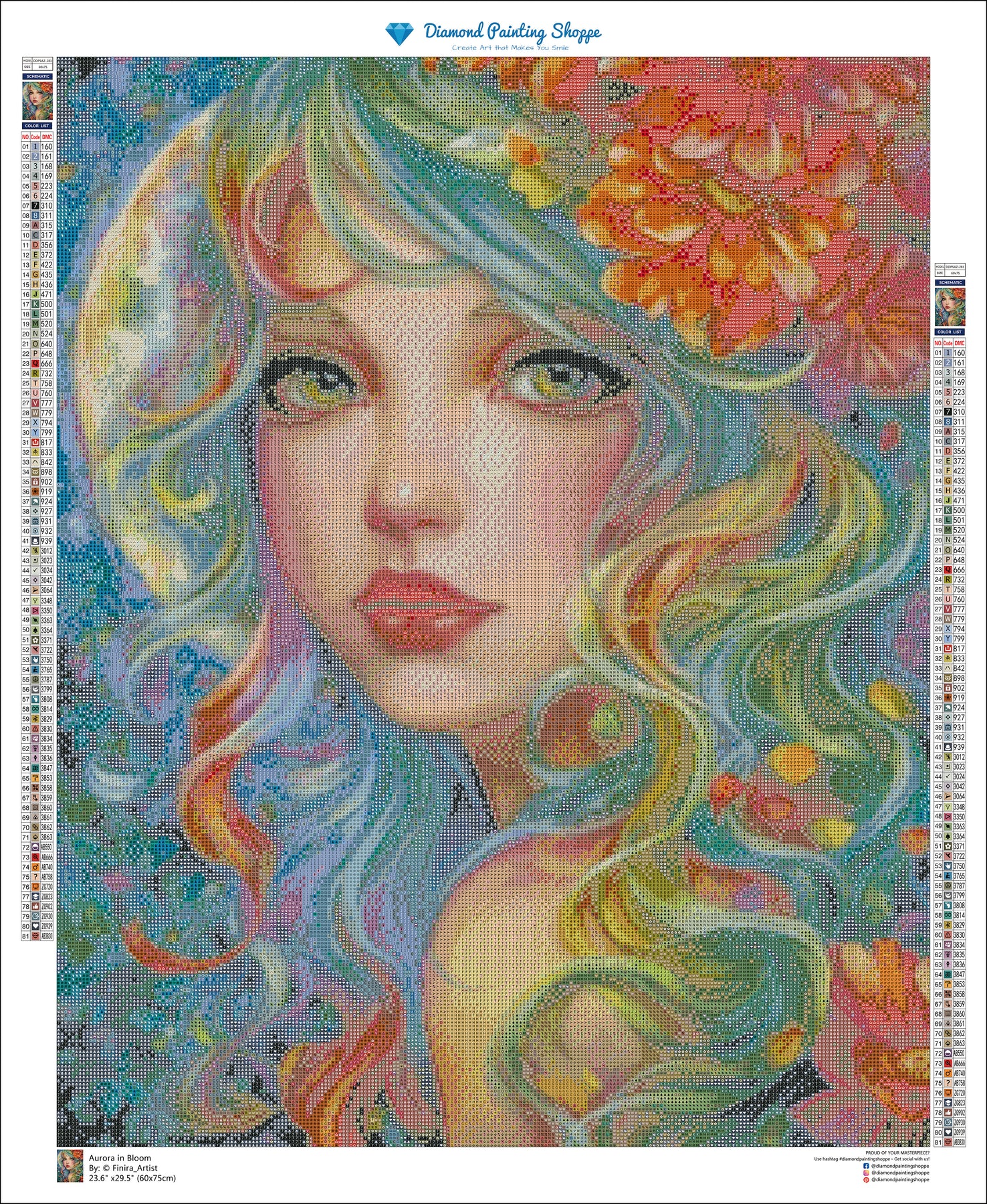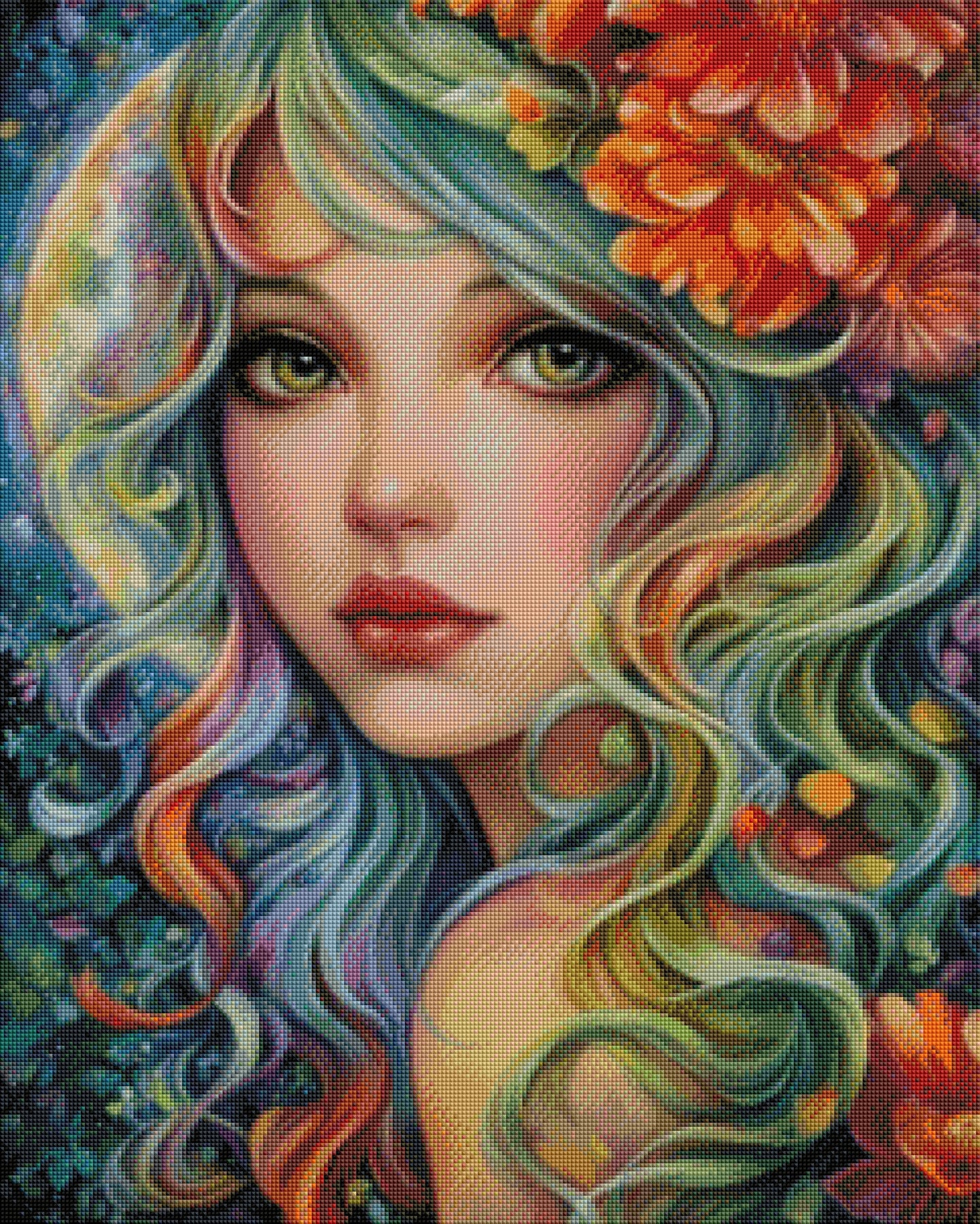 Bathed in color and quiet magic, Aurora in Bloom captures a luminous spirit crowned with blossoms and flowing pastel hair. Her gentle gaze feels like spring’s first breath—soft, hopeful, and alive with possibility. Every diamond placed brings this floral dream to life.