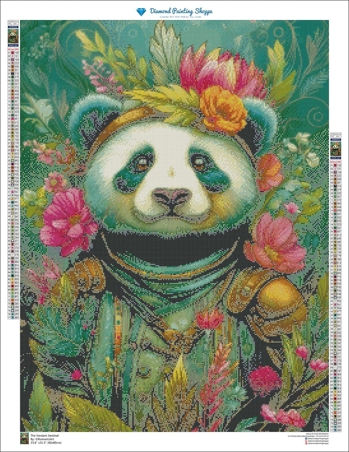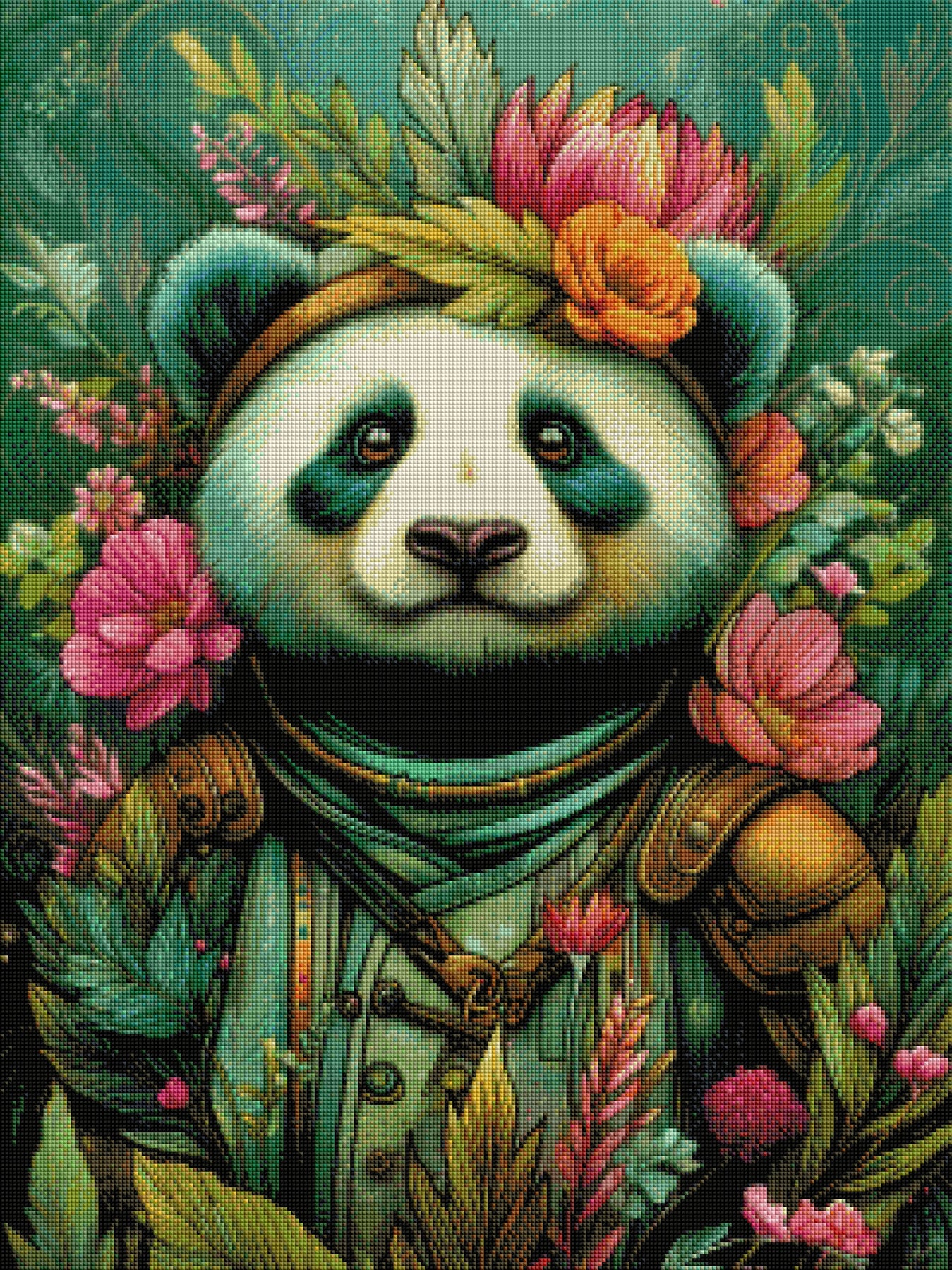 Fantasy artwork of a panda guardian wearing leafy armor and floral crown in a lush forest setting, rendered as a diamond painting.